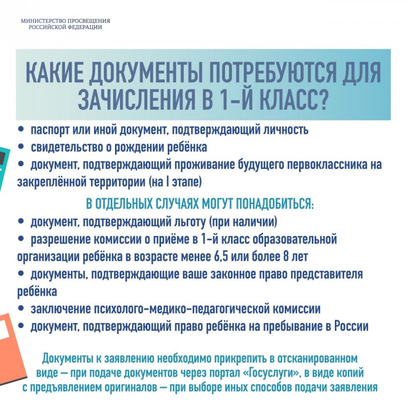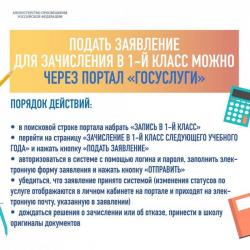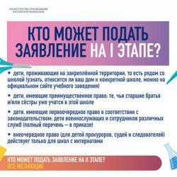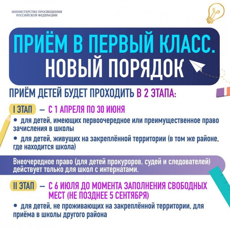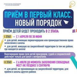 - прием заявлений в первый класс детей, проживающих на закрепленной территории, начинается с 1 апреля текущего года и завершается 30 июня текущего года;