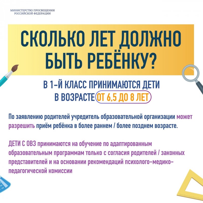 В первый класс принимаются дети, достигшие к 1 сентября текущего года возраста 6 лет и 6 месяцев, но не позже достижения ими возраста 8 лет