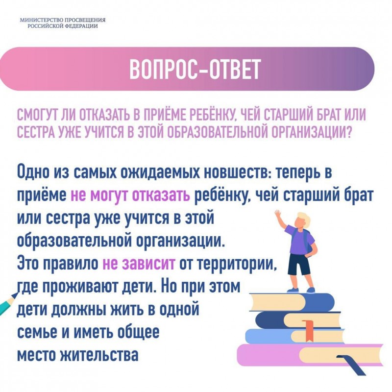 Правом на первоочередное предоставление места в образовательной организации в соответствии с законодательством Российской Федерации и нормативными правовыми актами субъекта РФ обладают дети военнослужащих, сотрудников полиции, уголовно-исполнительной системы, федеральной противопожарной службы, таможенных органов и органов принудительного исполнения. Преимущественным правом обладают дети, чьи братья и сестры уже обучаются в образовательной организации.
